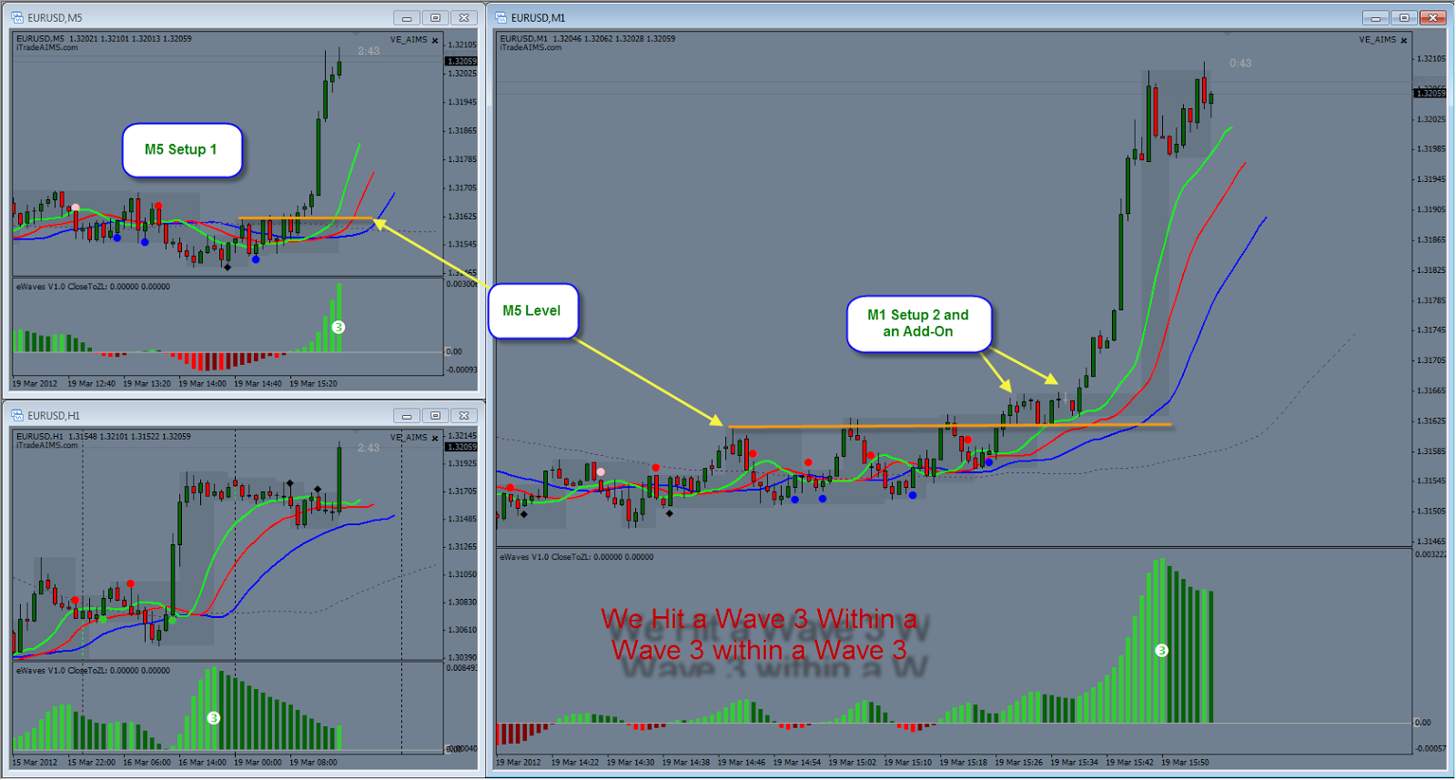 London Open Started with a typical Monday Morning session with absolutely no movement at all. H1 was retracing back to AIMSigator’s mouth. Once the retrace was over it took off nicely. A fantastic setup on M5 followed an supported by a Setup 2 on M1. It was wonderful. When the charts move they create a perfect Elliott Wave all the time.